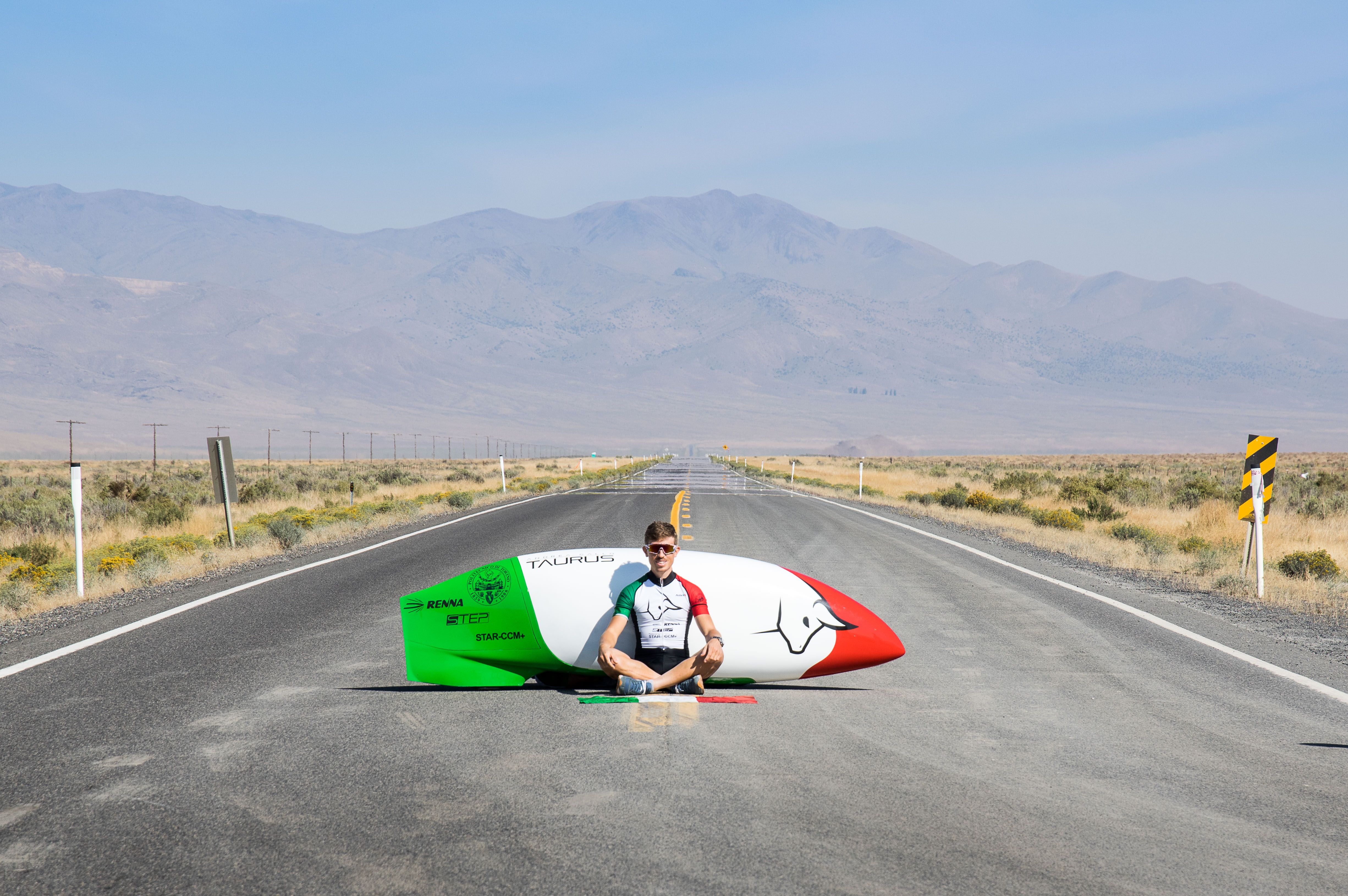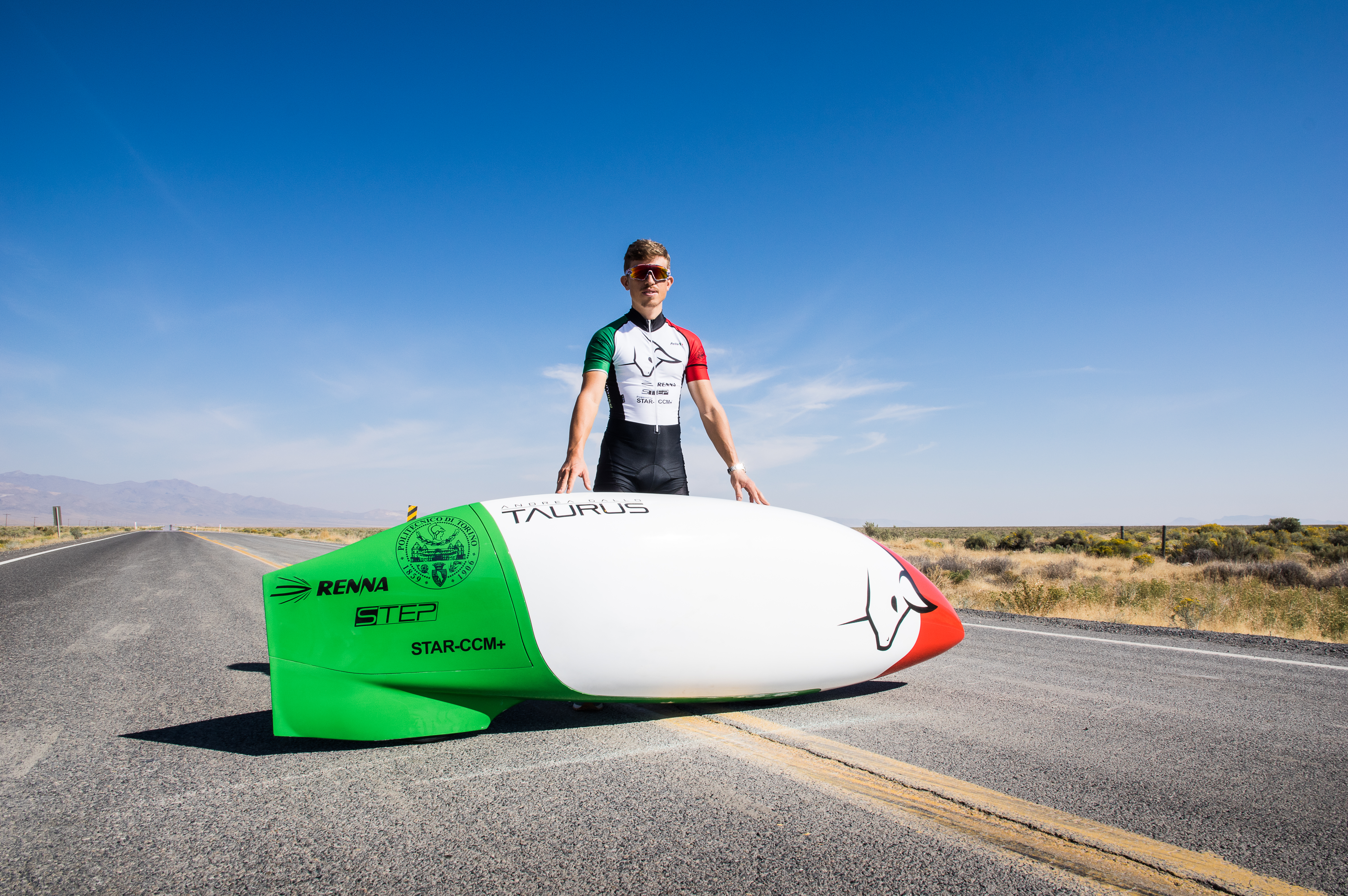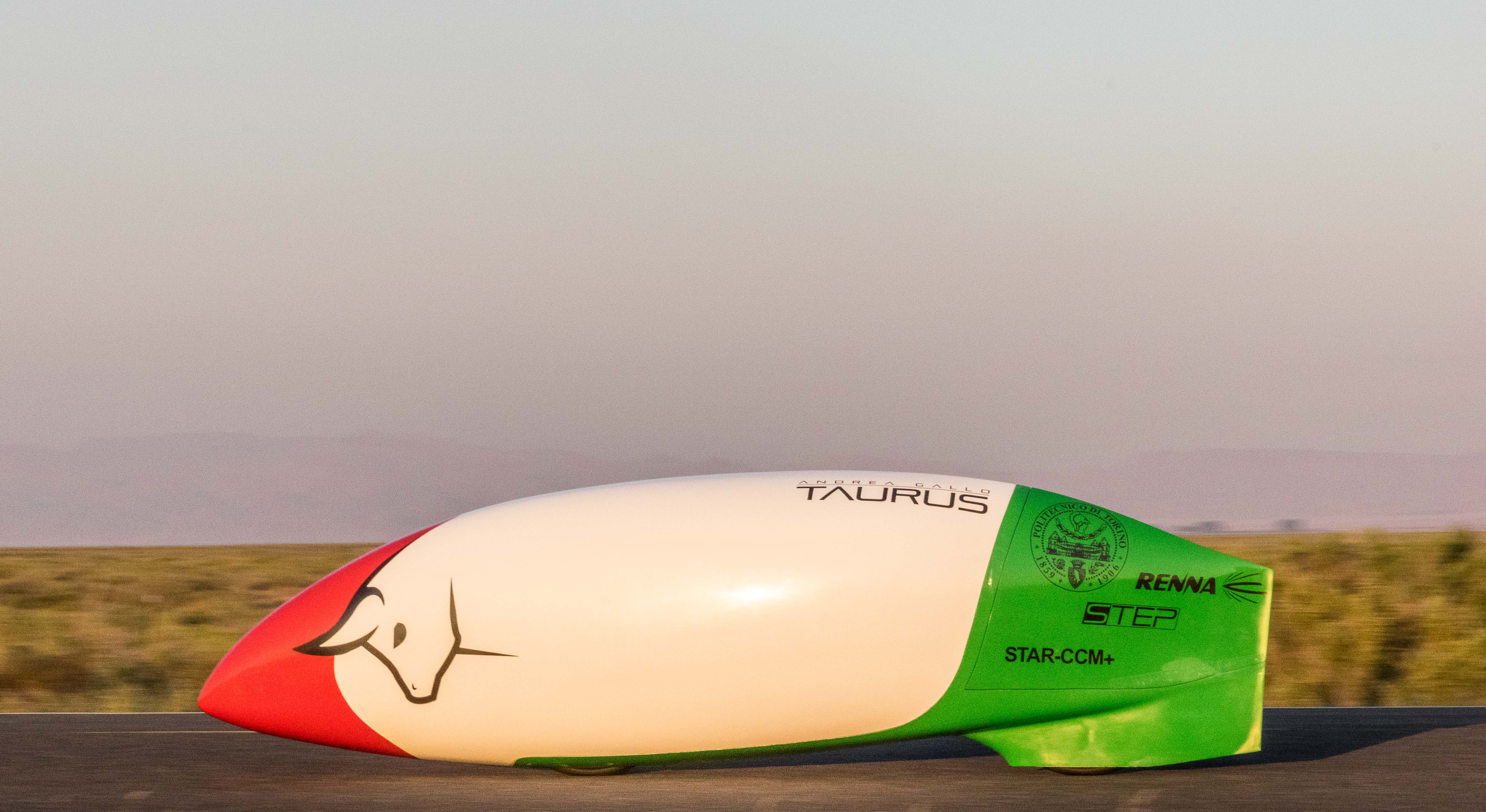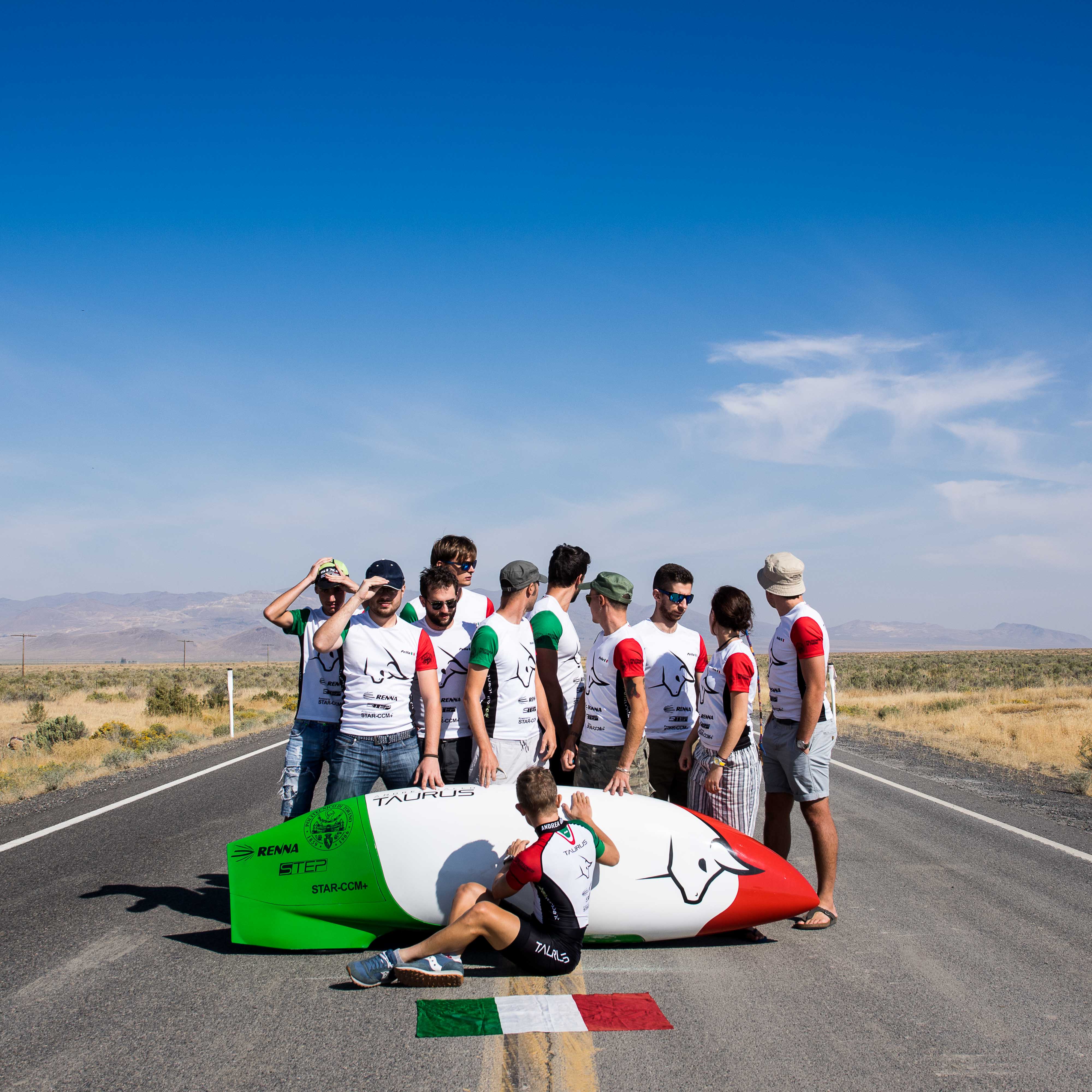 In 2017 we show up at Battle Mountain with a completely new prototype, TAURUS, whose name is inspired by our hometown, receiving appreciations from the senior competitors for our innovative solutions: a composite fairing with a very low drag and a new transmission with a moving sprocket set patented by some of our team members. It is in this way that Andrea Gallo, shielded by a fairing with the italian flag colors, makes it through the first phases of qualification crossing the finish line at 105 km/h. Despite the bad weather of the week, Gallo progressively augments his velocity until a final one of 122.32 km/h. The determination to break the world record remains our main target, but we acknowledge the necessity to ulteriorly improve and test our newly created prototype.