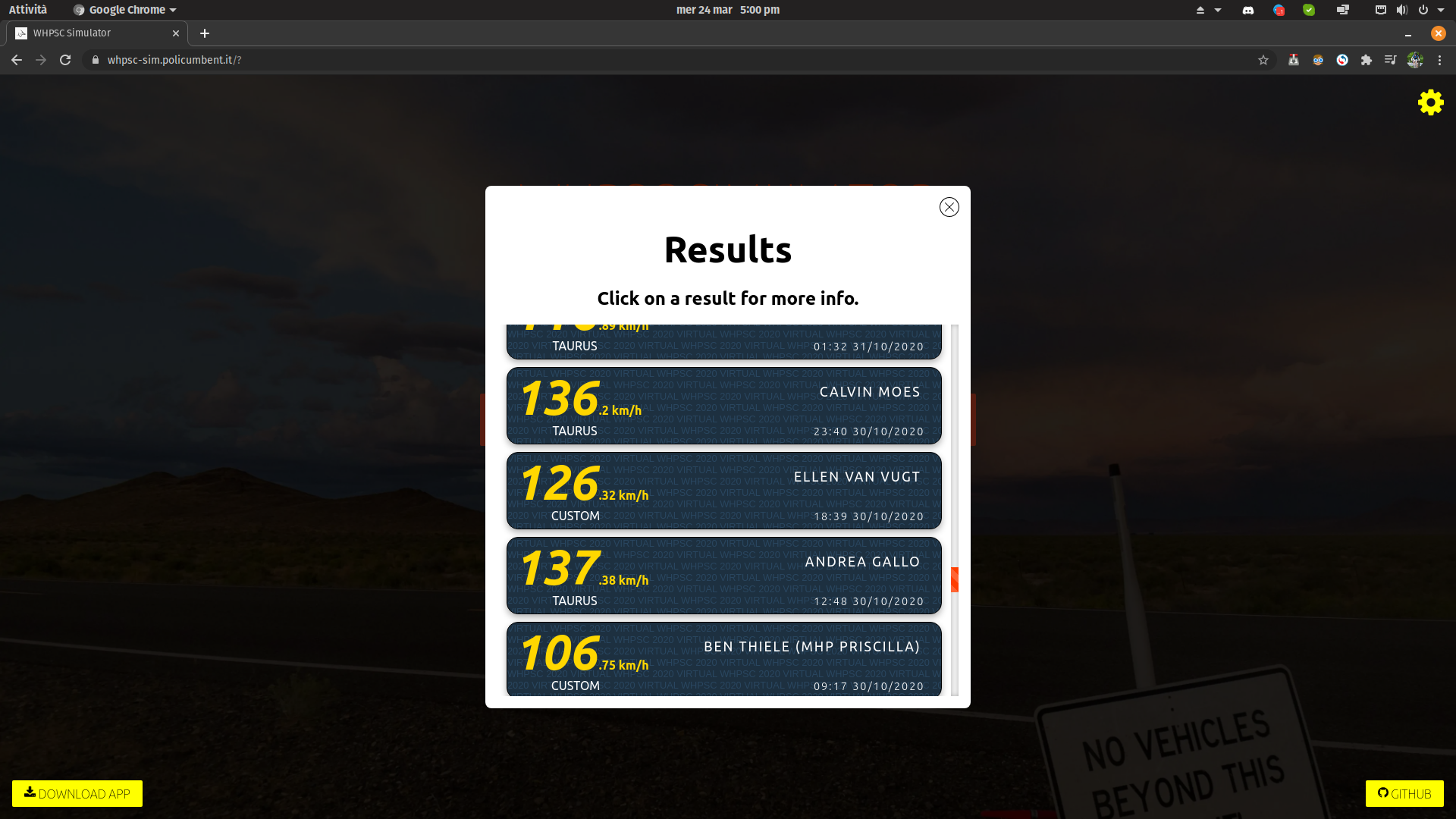 2020 is a tough year for everybody: the pandemic that shakes up the world makes it impossible to hold the WHPSC. The team, though, never stops working and keeps himself busy with the construction of a completely new prototype, even if with some delay. The spirit of Battle Mountain as well never leaves us and makes us think that there is still a way to make the WHPSC happen: in a perfect 2020 theme, “virtually”. We developed a simulator that allows people to insert coefficients and data in the system and brings the rider through a complete run taking the power input from a trainer. Through the data set, it’s possible to see the velocity that would be reached with a prototype like Taurus. We make our simulator available to all of the other teams and communities around the usual challenge. The event, held in a non competitive way, is a success and allows us to keep it up and reunite the fonds of the WHPSC.